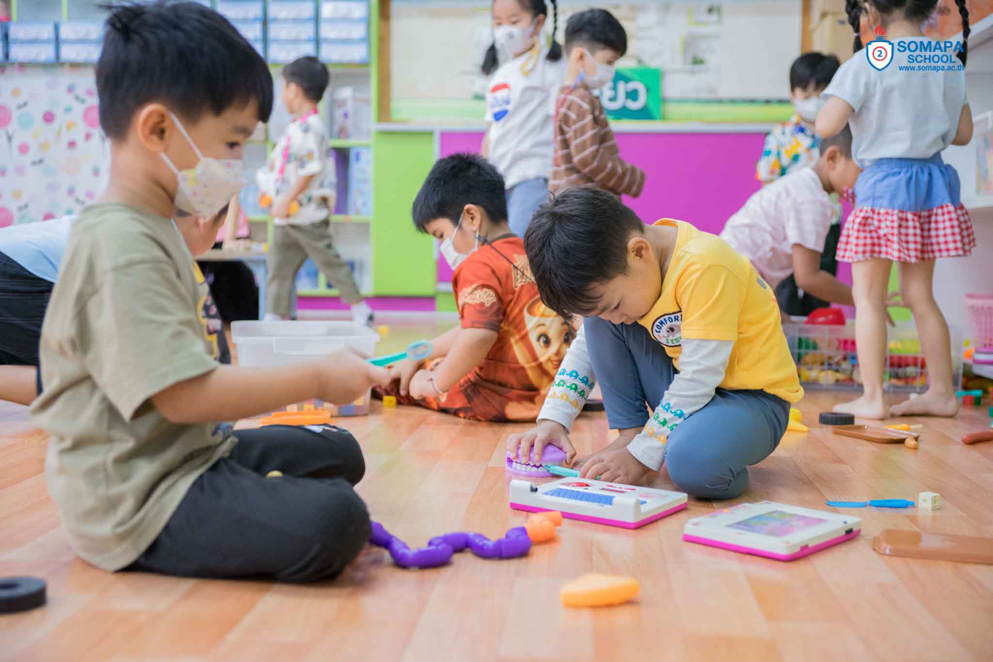 - บรรยากาศการเล่นของเล่นสำหรับเด็กอนุบาลช่วยส่งเสริมพัฒนาการทุกด้าน โดยมีทั้งการเล่นที่เน้นกล้ามเนื้อ (เช่น การเล่นกับลูกบอล, การปีนป่าย) การเล่นเพื่อเสริมสร้างสติปัญญา (เช่น ตัวต่อ, จิ๊กซอว์, ของเล่นที่ฝึกการแก้ปัญหา)